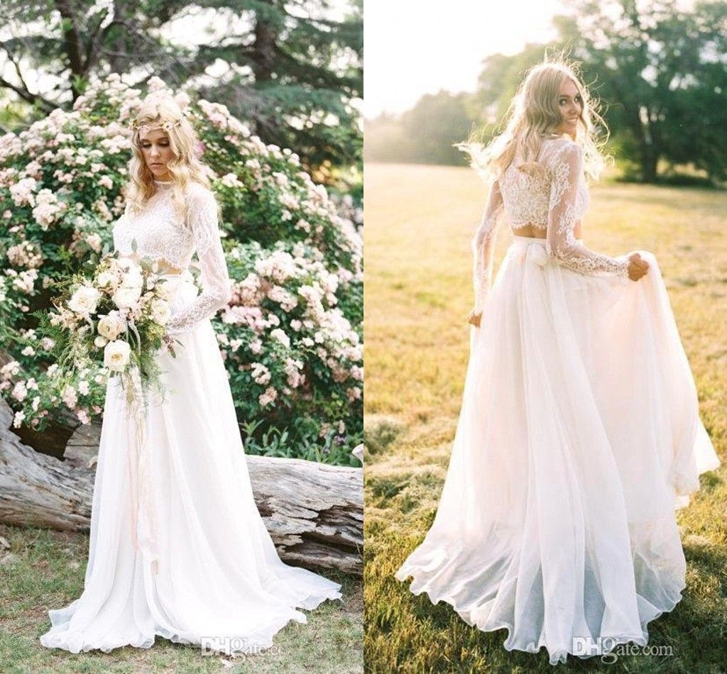 Boho Style Lace Sleeved Two Piece Wedding Dresses Beach Bridal Gowns Online Wedding Dress White Prom Dress Prom Dresses Two Piece